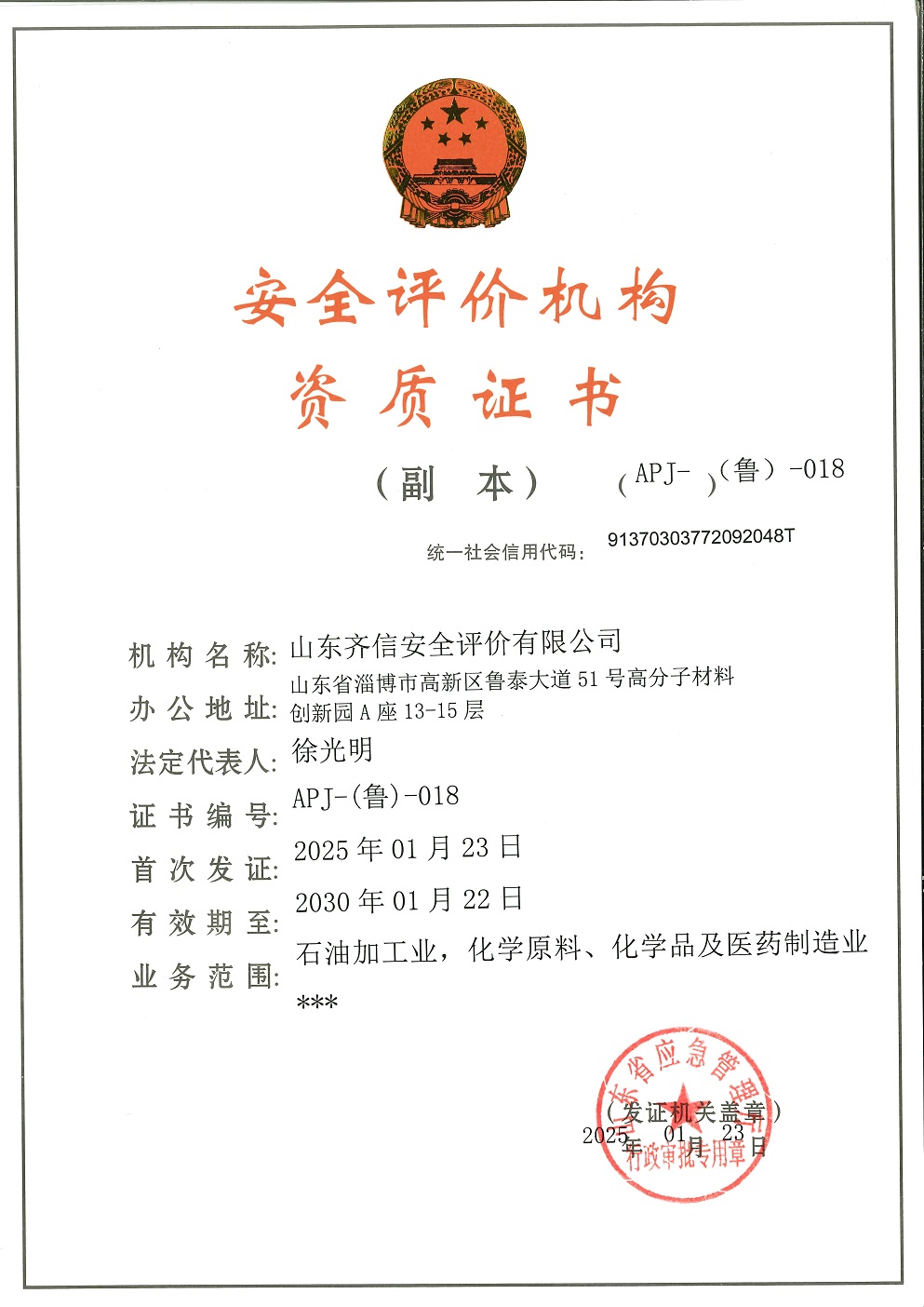 山東齊信安全評價有限公司成立于2005年3月,注冊資本300萬元人民幣,固定資產總值804.8728萬元。法定代表人徐光明,注冊地址及辦公地址位于淄博高新區(qū)魯泰大道51號高分子材料創(chuàng)新園A座13-15樓。2005年9月取得安全評價機構乙級資質。自國家應急部1號令實施以來,公司于2020年1月15日取得新安全評價資質,業(yè)務范圍包括:陸上油氣管道運輸業(yè);石油加工業(yè),化學原料、化學品及醫(yī)藥制造業(yè);金屬冶煉。2018年12月21日取得安全生產標準化二級評審單位,評審范圍:危險化學品、紡織、建材、輕工、冶金、機械。 公司現(xiàn)有人員41人,其中專職安全評價師37人,注冊安全工程師26人,研究員1人、碩士5人、雙學士1人,山東省安全專家?guī)鞂<?人、教授級高工1人,高級工程師8人、工程師22人,專職危險化學品標準化評審員、工商貿標準化評審員30人,本科以上學